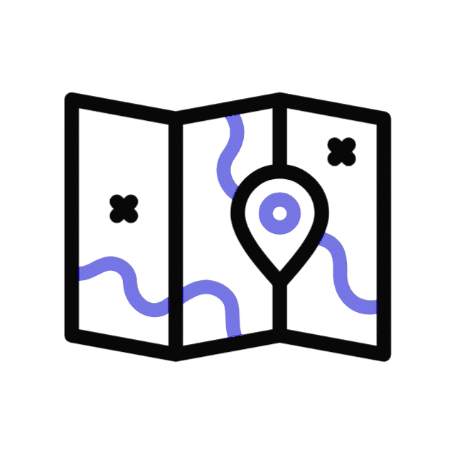 Une carte stylisée avec une épingle de localisation en son centre, zones cartographiques en fil de couleur bleue et marques de points sur la carte.